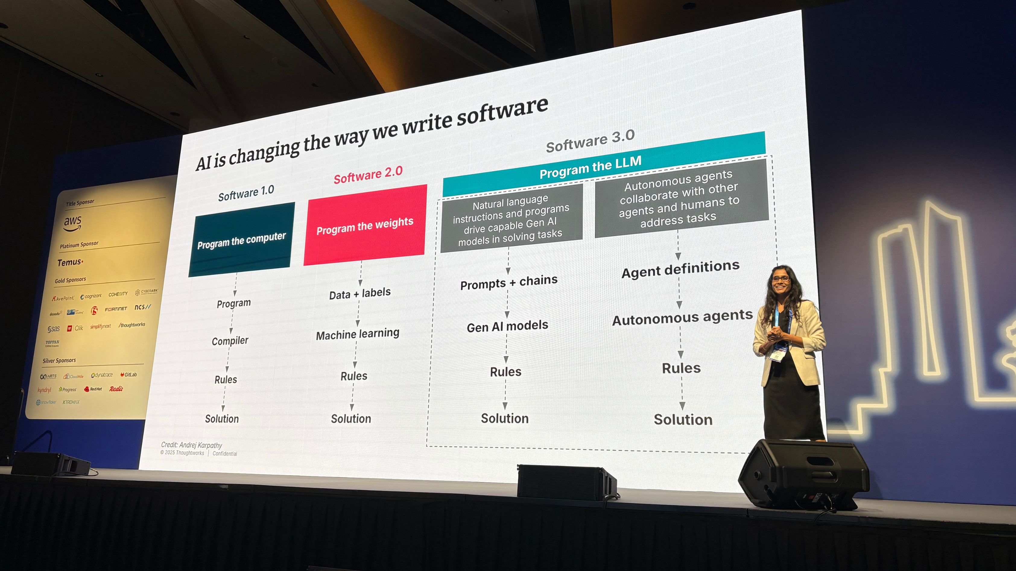Thoughtworks' Head of Technology Vanya Seth was speaking about AI-First Software Delivery: Superpowers, adoption challenges, and the path to Software 3.0 at the AWS Public Sector Day in Singapore. Image: Thoughtworks