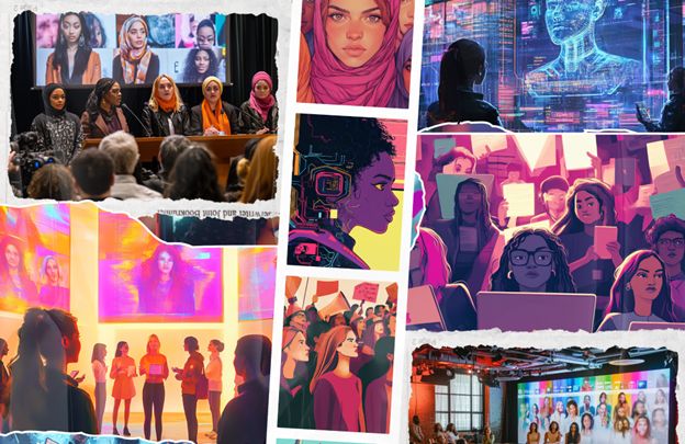 A collage of images produced by Midjourney when it was given a text prompt by the authors to imagine a world where women and female activists confidently use digital spaces, free from cyber misogyny. Image credit: Ariticle authors.