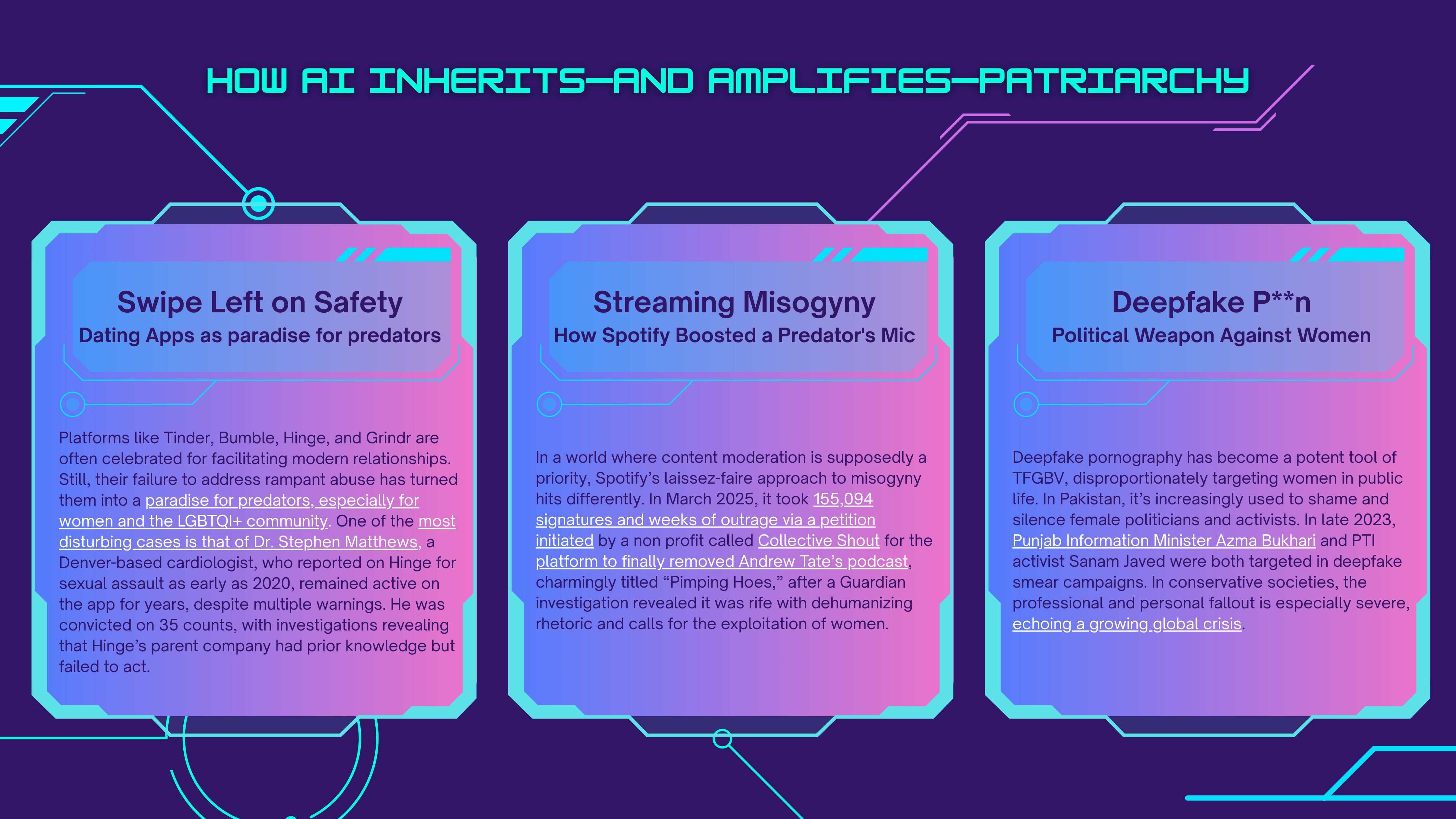 For example, major tech platforms are shadow-banning women's health information while propagating manosphere content to men, LinkedIn censoring women voices not hiding gender biases anymore, Meta scrapping its fact-checking programme, and the exodus of organisations from X (formerly Twitter) due to rising hate speech under Elon Musk’s ownership, only further illustrating how digital safety is eroding.